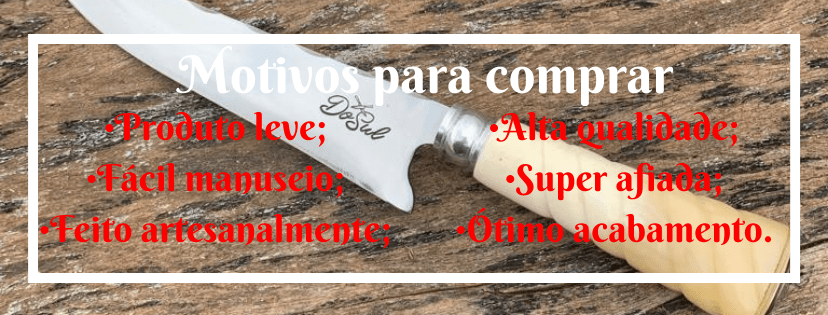 A FACA ARTESANAL PERSONALIZADA da DOSUL CUTELARIA, foi pensada e fabricada para aqueles apaixonados por churrasco, sua lâmina super afiada facilita o corte e deixa seu churrasco ainda mais charmoso. O produto é feito artesanalmente por uma equipe especializada, com anos de experiência no ramo da cutelaria, toda a sabedoria e aprendizado dessa equipe foi colocado no produto e por isso nossos produtos possuem altíssima qualidade.